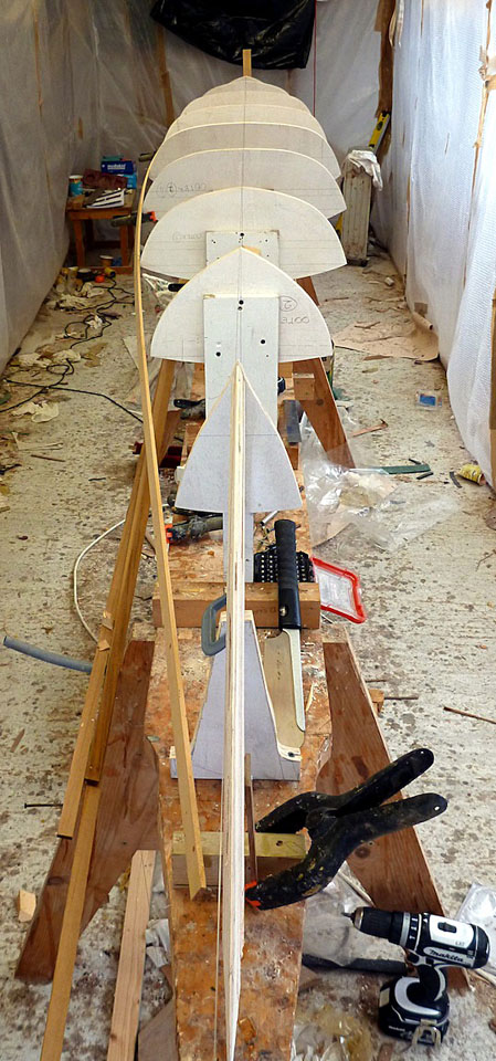 Here the fishing line along the keel is visible. A long strip is used to check that there are no bumps or dips, that the sheer-line has an attractive sweep to it, and that the hull is fair all over.